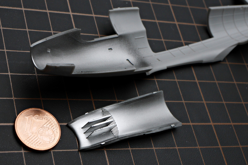 Aufgrund der schönen Teile kam ich beim Bau zügig voran - nur hätte ich einigen Nähten noch mehr Aufmerksamkeit spendieren sollen, denn eine Lackierung in Naturmetall ist gnadenlos! Als Buggewicht werden in der Anleitung 10 Gramm erwähnt. Ich empfehle etwas mehr, allerdings ist mein Schrot auch nicht ideal platziert. Nachdem der Raum vorne gefüllt war, habe ich noch etwas seitlich des Bugfahrwerksschachtes eingefüllt. Letztendlich zeigt eine Waage unter dem Vorderrad 3 Gramm an - sehr viel weniger hätte es also nicht sein dürfen.