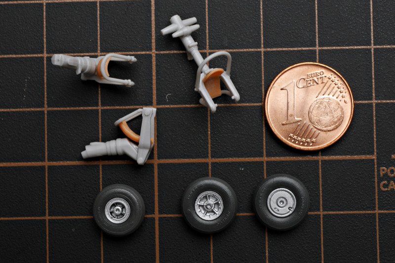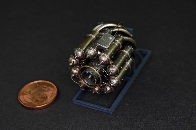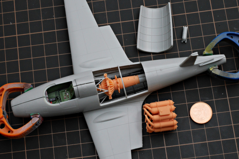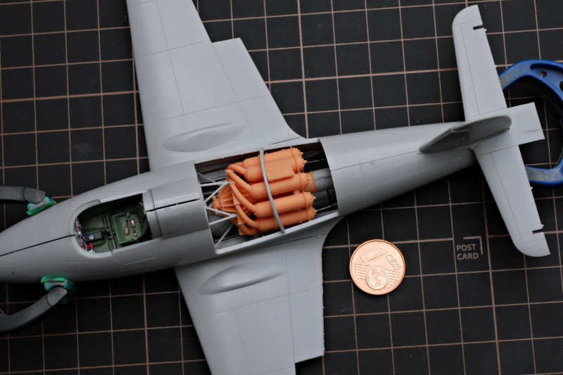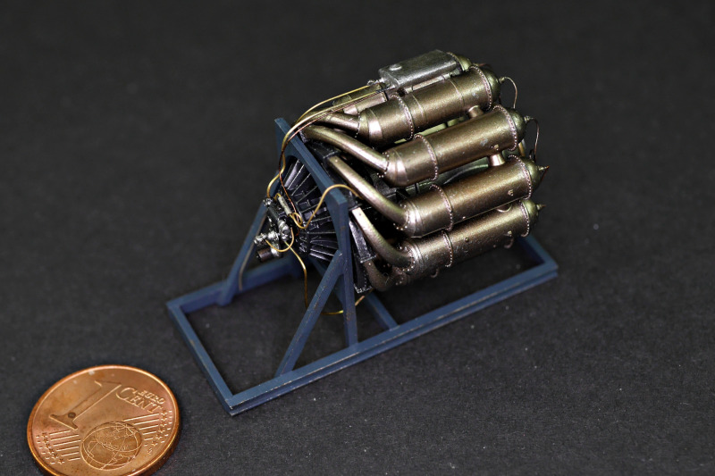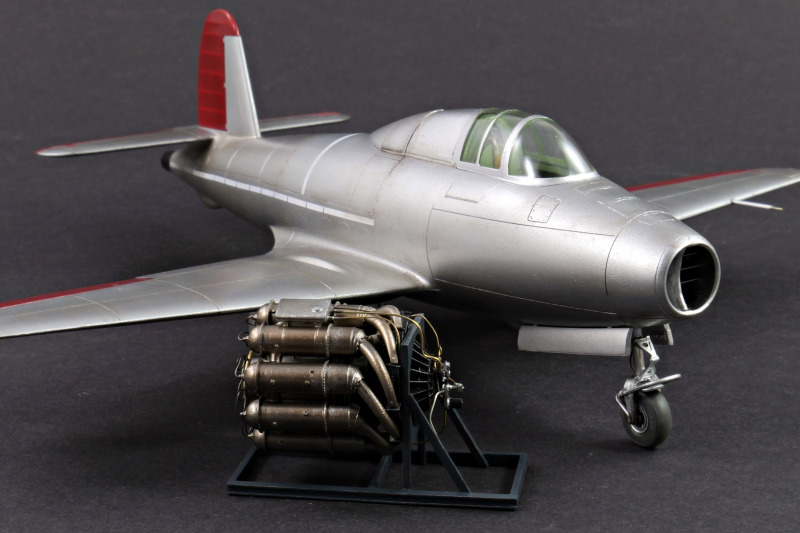 Für mein Modell benutzte ich das zur Verfügung stehende Zubehör, ergänzt habe ich die Bremsleitungen und das bruchgefähdete Pitotrohr des Bausatzes durch Metall ersetzt. Der Bausatz berücksichtigt verschiedene Rüststände mit optionalen Teilen wie Kabinenhauben, Schubdüsen und zusätzlichen Seitenrudern. Eigentlich wollte ich das Triebwerk im offenen Rumpf zeigen, aber irgendwie fehlten mir zu viele Teile, denn bisher ist nur die Starter-Edition und im Gegensatz zu 1:72 (noch?) nicht die Expert-Edition erschienen. So ist das 3D-gedruckte Triebwerk daneben gelandet - der Ständer war Teil des Triebwerksbausatzes, sogar als Spritzguss!