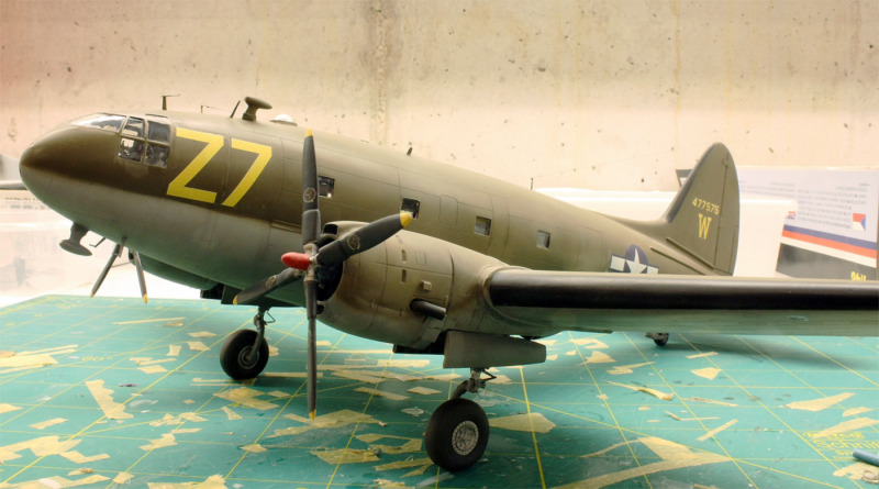 In Europa sollte die C-46 nur einmal in großer Stückzahl verwendet werden: im Zuge von „Operation Varsity“ im März 1945 lieferte die Commando an der Seite ihrer bekannteren Schwester C-47 Fallschirmjäger und Luftlandetruppen, die einen Brückenkopf östlich des Rheins etablieren sollten. Der verlustreiche Verlauf der Rheinüberquerung, bei der 19 von 72 eingesetzten C-46 verloren gehen sollten, sorgte in Europa für einen derart schlechten Ruf der großen Curtiss, dass man hier von weiteren Einsätzen absah. Ein Grund für das desaströse Abschneiden ist sicherlich auch in der Tatsache zu finden, dass die C-46 im Unterschied zur C-47 nie mit selbstdichtenden Tanks ausgestattet wurde. Das hier vorgestellte Modell zeigt eine bei „Operation Varsity“ eingesetzten C-46D Commando, die von der 313th Troop Carrier Group geflogen worden ist.