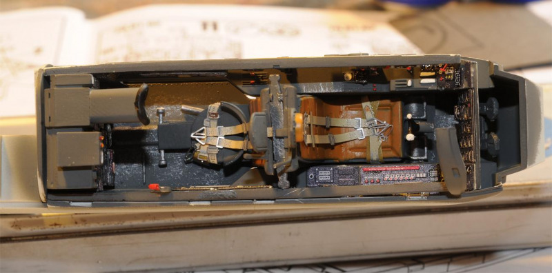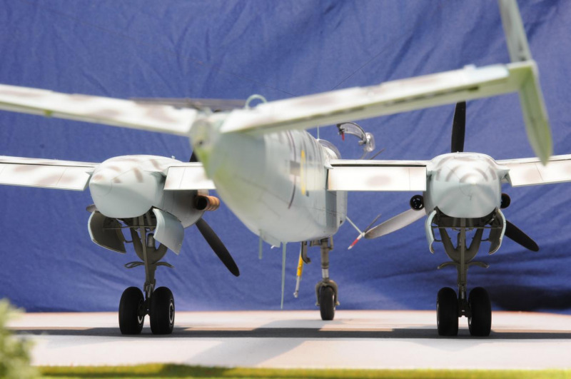 Durch die Hinweise in den anderen Vorstellungen aufmerksam gemacht, habe ich mich zwar relativ genau an die Bauanleitung gehalten, dennoch die Hinweise der anderen mit einfließen lassen. Der farbige Zubehörsatz für das Cockpit des Uhu von Eduard sowie passende Sicherheitsgurte wurde eingebaut. Das Bugfahrwerk wurde bei mir um 3 mm gekürzt. Alle Reifen wurden auf der Herdplatte auf Backpapier abgeplattet. Hinter das Cockpit und die vorderen Motorgondel wurden deutlich über 90 g Gewichte eingeklebt.