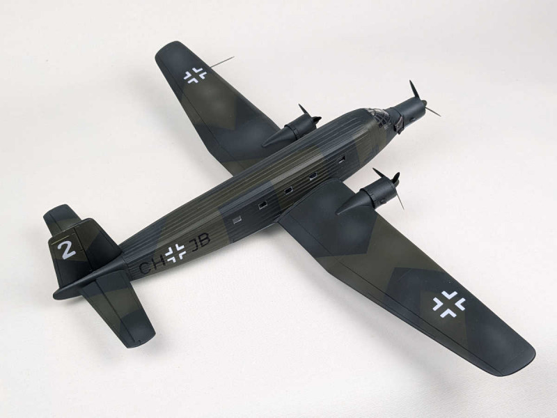 Die Junkers Ju 352 entstand als Nachfolger der Junkers Ju 252, die wiederum die Nachfolge der Junkers Ju 52 antreten sollte. Aber dieses Projekt wurde nicht weiter verfolgt. Bei der Ju 352 wurde auf verfügbarere Materialien zurückgegriffen. So bestand der Großteil des Rumpfes aus einem mit Leinwand bespannten Gittergerüst. Der erste Prototyp flog am 18. August 1943. Insgesamt sollen 19 V-Maschinen und 26 Serienflugzeuge bis August 1944 gebaut worden sein. Mein Modell soll den zweiten Prototyp Junkers Ju 352 V2 CH+JB, WNr. 352 10002, darstellen. Besonders auffällig im Gegensatz zur A-Version ist der fehlende Abwehrstand hinter dem Cockpit. Der zweite Prototyp flog erstmals am 8. November 1943. Nach zahlreichen Erprobungen bei Junkers kam sie im Dezember nach Rechlin. Dort erfolgten neben der Mustererprobung auch zahlreiche Transportflüge. Mindestens bis Mitte 1944 verblieb das Flugzeug in Rechlin. Danach kehrte sie zu Junkers zurück, wo sie noch im Februar 1945 nachweisbar war.