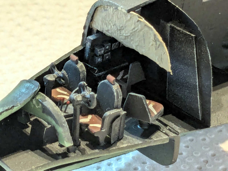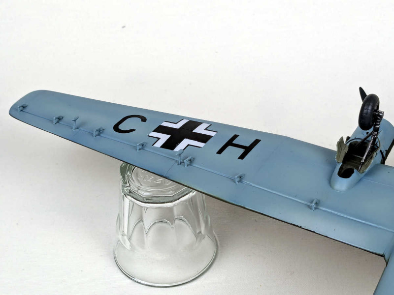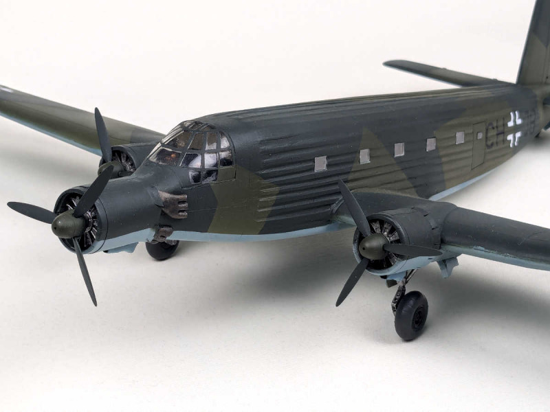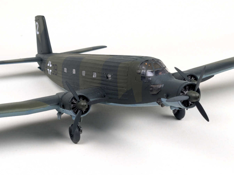 Der Bausatz von MACH2 ist sehr zwiespältig. Während die Passgenauigkeit relativ gut ist, sind die Details sehr grob und teilweise falsch. Die Oberfläche das verwendeten Plastiks ist recht rau. Die Rumpfstruktur der Leinwandbespannung ist nicht vorhanden, obwohl sie auf allen Fotos des Flugzeuges deutlich sichtbar ist. Ich habe versucht, diese Struktur darzustellen. Die Motorenverkleidung sind zu kurz und wurden entsprechend verlängert. Am Fahrwerk fehlt eine Verstrebung, die ergänzt werden muss. Das "Beste" war aber, dass der Spritzrahmen der Klarsichtteile ein Fenster zu wenig beinhaltet - also muss man ein Fenster selbst verschließen. Weiterhin ist das Cockpit falsch dargestellt. Die Trennwand zum Frachtraum ist weiter hinten als von MACH2 vorgesehen. Außerdem fehlen der Arbeitsplatz des Bordfunkers und der Platz für den Bordmechaniker. Auch die Verkleidung hinter den Sitzen von Pilot und Copilot sucht man vergeblich. Ein Fahrwerksbein muss zerschnitten und gedreht werden. Die Motoren und die Propeller wurden durch Teile aus dem Fundus ersetzt. Bemalt wurde mit Vallejo Farben, alle Kennungen wurden gespritzt, Decals fanden keine Verwendung.