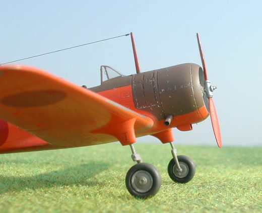 Im „Nakajima Ki-27 Nate“ Heft von KAGERO fand ich ein Bild einer Ki-79b mit ungewöhnlichem Fahrwerk. Normalerweise wurde bei der Ki-79 das Gabelfahrwerk der Ki-27 verbaut. Auf dem Bild waren aber die Räder größer und mit einer Einarmschwinge am Federbein befestigt. Und da die Maschine auf dem Bild auch noch die gleiche Tarnung hat wie ich sie an meinem Modell darstellen wollte, kam ich um einen Neubau des Fahrwerkes nicht herum. Mein Fahrwerk besteht jetzt aus der Schwinge einer P-51 und den Rädern einer Me-109, beides von Revell.