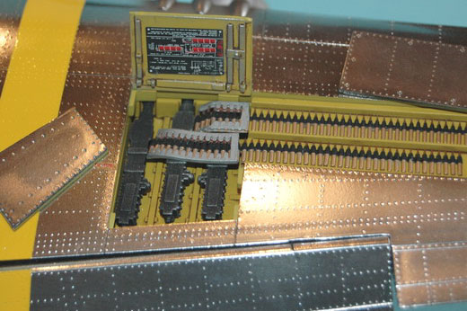 Das zweite Problem war die Lackierung. Gerade bei einem so großen Modell sollte das Naturmetall-Finish, in dem man sich spiegeln kann, perfekt zur Geltung kommen. Die polierbaren Farben von ModellMasters kamen nicht in Frage (eine frühere Mustang lieferte unbefriedigende Ergebnisse) also habe ich zum ersten mal die Farbe "Chrome" von ALCLAD2 ausprobiert und war begeistert. Mit selbiger Farbe habe ich dann auch die Hydraulikzylinder der Federbeine und Fahrweksklappen geairbrushed.