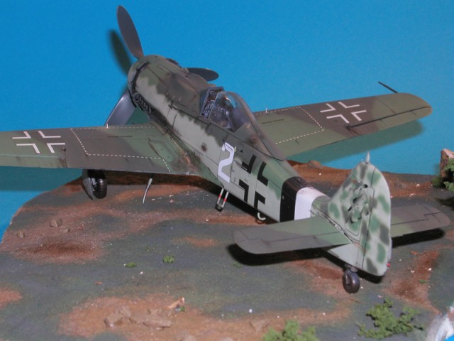 Die Lackierung:Im Jahre 1990 wurde eine FW 190 D-9 aus dem Schweriner See geborgen. Diese Maschine gehörte zur 2./JG 26 und diente mir als Vorlage für mein Modell. Die Lackierung besteht aus RLM 82, 83, 84 von X-tra Color, wobei es kein RLM 84 von diesem Hersteller gibt. Um diesem Abhilfe zu verschaffen, benutzte ich "RAF SKY" Nr. BS210. Das schwarzweiße Rumpfband war typisch für das JG26, wobei das Weiß ein wenig breiter war. Der Spinner wurde schwarz und die Propellerblätter schwarzgrün (RLM70) lackiert.