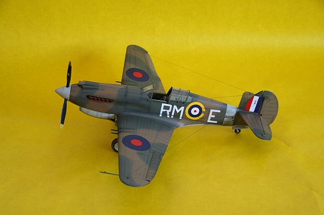 Nach einer Schicht Future fanden die Decals ihren Platz auf der nun glatten Oberfläche, welche nach Abschluss der Arbeiten nochmals mittels Future versiegelt wurden. Ein Ölfarben-Washing, leichte Schmauch- und Abgasspuren und ein Finish mit mattem Tamiya-Klarlack, sowie das Anbauen der separat gefertigten Baugruppen beendeten das Projekt an meinem Basteltisch bis auf eine Kleinigkeit. Die Antennenschnüre entstanden aus dünnem, unsichtbarem Nähgarn, an welchem mittels Holzleim Ausgleichgewichte angedeutet wurden - zudem verwendete ich statt der dem Bausatz beiliegenden Bremsleitungen solche aus dünnem Messingdraht.