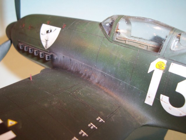 Die Bemalung erfolgte mit Revellfarben aus deren älterem "RLM"-Sortiment. Ich habe die Unterseite des Flugzeugs gemäß der mir vorliegenden Bilder kräftig gealtert. Der Bereich unter dem Motor und hinter dem Kühleraustritt sowie an einzelnen Klappen, die Hülsenauswurföffnungen, die Fahrwerksschächte, die Tragflächen im Schmutzradius der Räder, die Räder selbst.... ein Fest für Ölfarben und Pastellkreide!