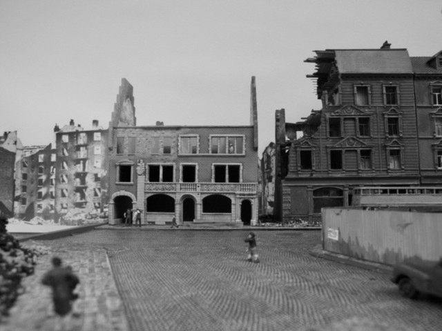 DioramaDas Diorama ist, dank des Modellbahn-Zubehörs im Maßstab 1:160, abweichend vom Maßstab des Flugzeuges von 1:144. Kein Problem - ein Diorama sieht man meist mehr oder weniger von oben an, wobei das Flugzeug dem Betrachter näher ist als das Gelände darunter, daher darf der Maßstab für das Flugzeug ruhig etwas größer sein. Während die drei Häuser auf der einen Straßenseite von Faller bzw. Kibri stammen, wo, soweit sichtbar, die Wände mit Plasticart auf 2 mm aufgedickt wurden, ist das völlig zerstörte aus 2mm-Plasticart-Platten gescratcht. Das Straßenpflaster sowie die Innenwände bestehen aus Fotokopien von unterschiedlichen Pflaster- bzw. Mauerdarstellungen aus dem Modellbahnladen. Diese sind mittels Ponal an die Wände „tapeziert“ und teilweise mit Grau übermalt. Die Trümmerhaufen bestehen aus schwarz gestrichenem Styropor sowie klein geschnittenen grauen Plastikresten. Der Trümmerberg gegenüber dient Kindern, welche die „Rosinenbomber“ beobachten, als Aussichtsplattform. Hier warteten die kleinen „Candy Spotter“ darauf, dass Schokoladenriegel an kleinen Fallschirmen abgeworfen wurden, um sie schnell einzusammeln. Der Ständer für das Modell ist aus einer Klarsicht-Plastikplatte ausgesägt. An einer Ecke ist die Dioramenplatte eingesägt, hierin ist der Ständer eingesetzt.