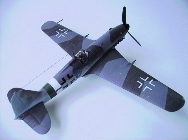 Beim Bausatz handelt es sich um die Fiat G.55 des tschechischen Herstellers SMER aus den 70er Jahren. Er ist – positiv ausgedrückt – eine echte Herausforderung. Die Teile sind sehr detailarm und teilweise erschreckend unsauber gespritzt; die Passgenauigkeit ist mangelhaft. Dementsprechend musste sehr viel gespachtelt, geschnitten, geschliffen und geflucht werden. Aufgewertet wurde das Modell durch einige selbst gefertigte Teile für Cockpit, Kühler und Fahrwerk. Außerdem erhielt das Modell einen Piloten und einen neuen Reifensatz aus der Restekiste. Die MG-Öffnungen über dem Motor wurden verspachtelt. Die Bemalung erfolgte ausschließlich mit dem Pinsel. Folgende Farben fanden Verwendung: Gelb RLM 04 (Model Master 2072), Dunkelgrau RLM 74 (Gunze H68), Grauviolett RLM 75 (Model Master 2085), Lichtblau RLM 76 (Model Master 2086). Die Decals entstammen der Restekiste. Als weiterführende Literatur kann ich den u.g. Artikel von Dietmar Hermann empfehlen.