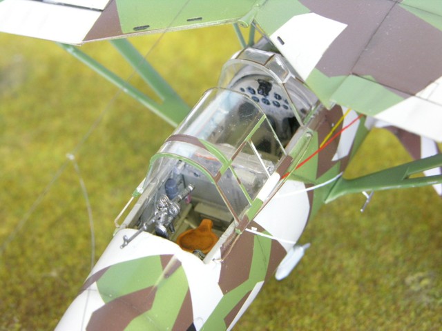 Nicht ganz so glücklich war ich mit der Bauanleitung von ICM. Die Explosionszeichnungen sind recht klein und undeutlich gehalten. Gerade im Bereich des überaus reichhaltig ausgestatteten Cockpits hatte ich mitunter Schwierigkeiten, die vielen Gerätschaften, Armaturen und Schalter korrekt zu platzieren. Ist mir mit Sicherheit auch nicht 100%ig gelungen. Das nächste Problem sind die extrem filigranen Flügelstreben, die zudem nur äußerst winzige Klebepunkte aufweisen. Wie soll da die große und recht schwere Tragfläche gehalten werden? Nun, es funktionierte dann doch. Trotzdem ist beim Aufsetzen des Flügels Nervenstärke, eine ruhige Hand und viel Fingerspitzengefühl gefragt. Belohnt wird man dafür mit maßstäblich korrekten Streben, die das Modell ungemein aufwerten.