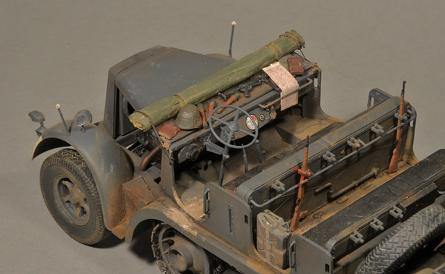 Mein Modell gehört zum Fahrzeugpark der 10. Inf Div (mot) und ist irgendwann im späten 1942 im Osten unterwegs gewesen. Lackiert hab ich mit German Grey von Vallejo (etwas aufgehellt). Verschmutzung, Alterung mit Pigmenten und Washing.