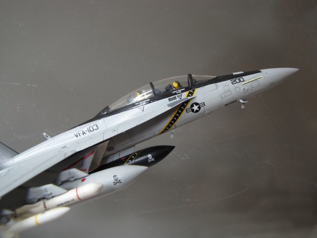 Der Bausatz stammt von der Firma Revell und ist im Maßstab 1:72. Die Qualität des Bausatzes ist wirklich sehr gut, fein versenkte Gravuren und eine breite Waffen/ Tankauswahl für sämtliche Aufhängungspunkte. Im Cockpit finden sich Instrumentenboards mit erhabenen Bildschirmen. Nur die Seitenkonsolen sind flach gehalten. Die ausgezeichneten Decals lassen die Dekorierung von zwei Einsatzmaschinen der US Navy zu. Einmal eine „graue Maus" der VFA-11 Red Rippers und eine etwas „buntere" der Einsatzstaffel VFA-103 Jolly Rogers. Die Passgenauigkeit ist wirklich sehr gut, so gab es keine Schwierigkeiten beim Zusammenbau.