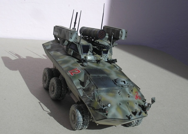 Ich baute das Modell auf Basis des Trumpeter Kit 00393 "USMC LAV-AD". Den Rumpf modifizierte ich, indem ich zwei Kästen entlang der Seiten anbaute, die aus 1mm ABS entstanden. Die zweiten Fronträder samt Aufhängung wurden entfernt. Die verbleibenden sechs Räder wurden je zwillingsbereift und ein zweiter Luftabwehrraketenwerfer auf dem Turm installiert. Dazu kamen noch diverse Teile aus anderen Bausätzen. Die Farben stammen von Revell und die Decals aus der Restekiste. Ich hoffe, es gefällt euch!