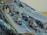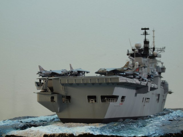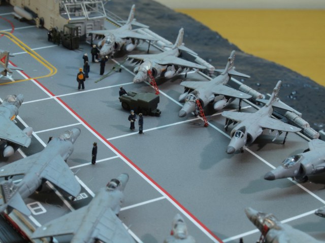 Schließlich konnte ich meine Decksfahrzeuge und Fluggeräte auf dem Flugdeck arrangieren. Die Szene stellt den Beginn der Flugoperationen dar: Der „Plane Guard“-Hubschrauber und der Luftraumüberwachungs–Hubschrauber stehen unmittelbar vor dem Start; Ersatzhubschrauber stehen schon bereit; und das gesamte Achterdeck ist komplett voll mit Harriern, die bald einer nach dem anderen über die Skischanze abheben werden. Eine Anzahl Figuren, hauptsächlich von PitRoad, sowie fotogeätztes Zubehör wie Zugstangen und Einstiegsleitern, wurde zur Belebung der Szene eingesetzt. Ein Überzug mit mattem Klarlack zur Abdeckung der Klebstoffspuren und Weißleim zur „Verglasung“ der Brückenfenster schlossen das Projekt ab.