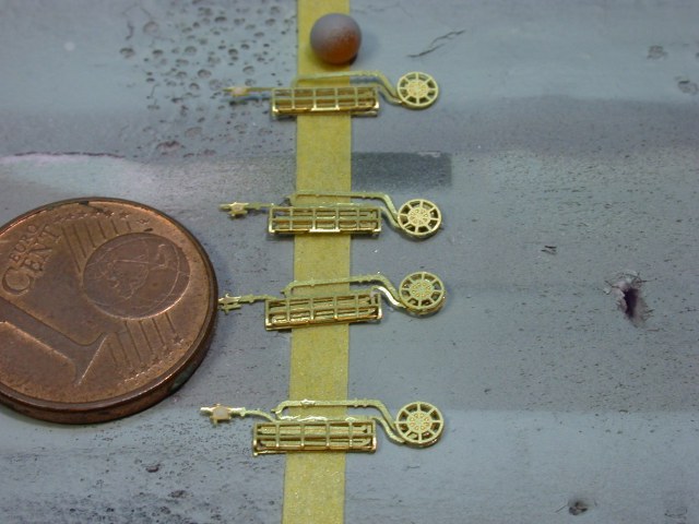Ein Schiff dieser Größe benötigt jede Menge Rettungsinseln. WEM bietet fotogeätzte Unterkonstruktionen dafür an, um den Realismus zu erhöhen. Ich schnitt diese Teile auch aus und lackierte sie, aber scheute dann doch davor zurück, die ganzen Rettungsinselbauteile auseinanderzusägen und nachzuarbeiten. Ich habe sie aus dem Kasten belassen und bilde mir ein, dass sie die verzogenen Catwalks stabilisieren.