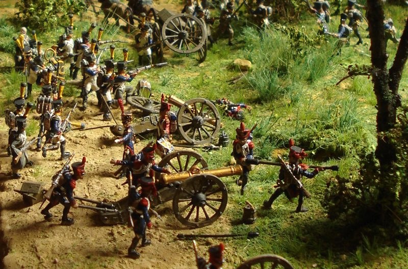 Das aus ca. 180 Figuren bestehende Diorama stellt ein fiktives Gefecht zwischen Preußen und Franzosen zur Zeit der Napoleonischen Kriege dar. Es sollte weniger eine realistische Gefechtssituation dargestellt, sondern vielmehr die Wirkung eines Schlachtengemäldes erzielt werden, das die tatsächlichen Geschehnisse auf einem Schachtfeld lediglich zitiert und dramatisiert. So habe ich viel Wert gelegt auf die Naturgestaltung und auf die Verteilung der Figuren über die Fläche. Das Gelände und die Erde wurden hauptsächlich aus gefärbten Gips auf Styropor hergestellt, für den Bewuchs wurde auf den Modelleisenbahnbedarf, Pinselhaare und Hanf zurückgegriffen. Im Eigenbau entstanden die Bäume. Die vereinzelt umgebauten und ergänzten Figuren, Pferde, Kanonen und Munitionswagen sind überwiegend von Italeri, Zvezda und Hät, aber auch ein paar Revellfiguren wurden verwendet. Das Bemalen der Figuren verteilte sich neben anderen Projekten über 1 1/2 Jahre, das einzelne Pflanzen der Grasbüschel mit Pinzette über zwei Tage. Vielleicht sollte ich mir doch mal Gedanken über einen Grasmaster machen.
