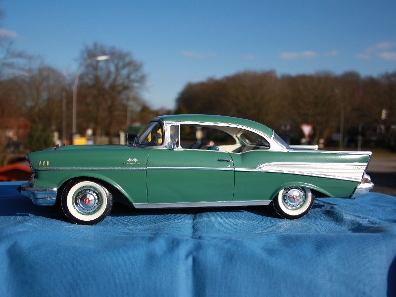 1957 Chevy Bel Air Sport Coupe1957 Chevy Bel Air Sport Coupe1957 Chevy Bel Air Sport CoupeFelgenränder in Wagenfarbe, das wird gern vergessen!Der Motor wurde verkabelt, im Kit ist schon alles dafür vorhanden.Auch die Kühlwasserschläuche sind dabei.Der Unterboden weist alle nötigen Details auf.