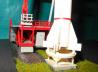 Glücklicherweise ging sonst nichts verloren und ich konnte den Bausatz OOB bauen. Bei der Farbgebung des Gleispaares, auf dem der Startturm von und zur Rakete fahren kann, habe ich bei befreundeten Modelleisenbahnern abgekupfert, und auch das Streumaterial abseits des Gleisbettschotters stammt von dort. Die Konstrukteure von Revell haben vorgesehen, dass vieles beweglich gemacht werden kann, wie es für die frühen Kits so typisch war: Bauen, spielen, zerbrechen, wegwerfen, neuen Kit kaufen, bauen, spielen,... usw. Den Kippmechanismus des Startgerüstes habe ich bewusst fix gebaut, weil sonst ja auch die Abspannung bzw. Steuerseile beweglich sein müssten. Dafür konnte ich nicht widerstehen, die Verschiebbarkeit der einzelnen Arbeitsbühnenhälften zu erhalten. Weil ich das ganze Startturmgefährt nur lose auf die Schienen aufgesetzt habe, sind zwei Displayvarianten möglich: Startturm unmittelbar an Rakete, Arbeitsbühnen geschlossen: