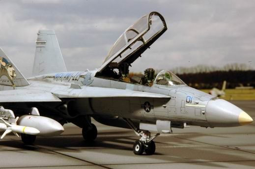 Der Bau startete wie üblich mit dem Cockpit-Bereich, für den ich Resin-Sitze und Photoätzteile aus einem Verlinden-Detailset verwendete, da sie das Modell doch erheblich aufwerten. Anschließend widmete ich mich den Flaps und Slats, da ich die Klappen in gefahrener Position darstellen wollte, um etwas Leben in das Modell zu bringen. Zur Darstellung der Maschine in SEAD-Konfiguration (surpression of enemy air defence) ergänzte ich den Bausatz mit Waffen aus den Hasegawa-Zurüstsätzen. Meine F-18D ist mit zwei Sidewindern, einer Amraam, einer Harm, einer GBU-16 und einem targeting pod bewaffnet