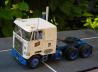 Die Neulackierung wurde in Mattweiß ausgeführt, was dem Truck bereits vor dem Drybrushing und Altern einen gebrauchten Eindruck verlieh. Bei der Farbgebung mit komplett blauem Fahrgestell inkl. der Tanks und Stoßstange hielt ich mich streng an das Kartondeckelbild des AMT Bausatzes Nr. T553 für den Cruiseliner „Schlitz“.