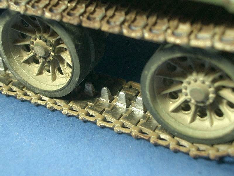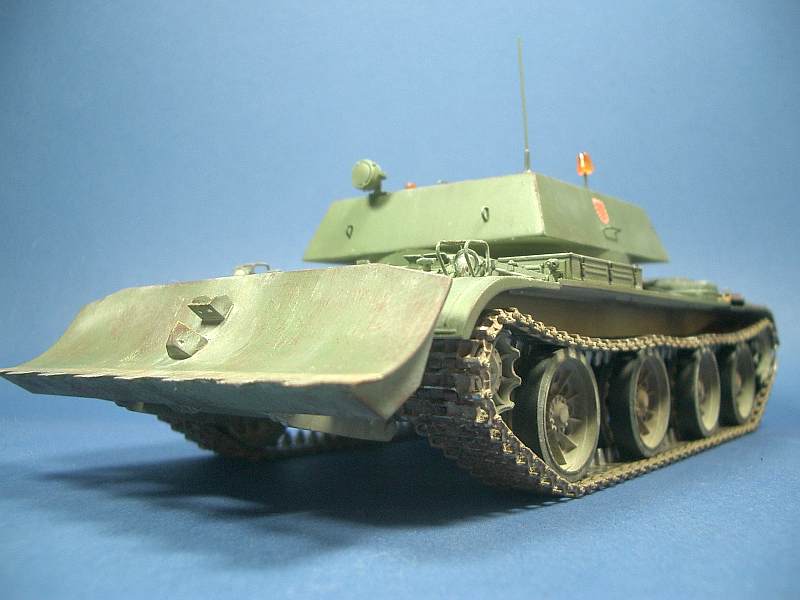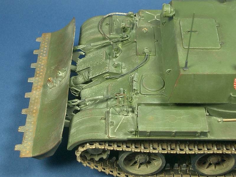 Für mein Modell nahm ich den Trumpeterbausatz der Fla SFL 57/2, wovon ich nur das komplette Fahrgestell benötigte. Den kastenförmigen Aufbau erstellte ich aus Plastkplatten, die zwei Rundumkennleuchten auf dem Aufbau schliff ich mir aus klarem Plastikgussast zurecht und bemalte sie mit transparenter orangener Farbe. Das am Bug montierte BTU-55 stammt von einem uralten T-55 Bausatz von Trumpeter, welches vor allem am Schubrahmen angepasst werden musste. Auf die wunderbaren Speichenlaufrollen von der Firma Miniarm wurde eine Kette von Friul gezogen.