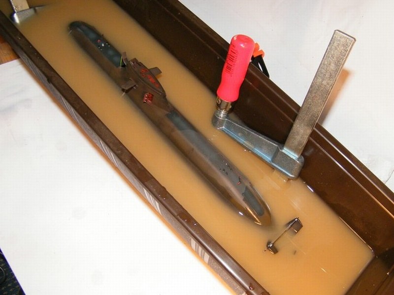 Danach wurde das Wasser mit normaler Schultusche und Acrylfarben in einer grau-braunen Brühe „verschmutzt". Das Boot blieb nun drei Wochen in diesem „Schwimmdock" .In dieser Zeit verdunstete das Wasser allmählich und es setzte sich ein dunkler dreckiger Belag am Bootskörper ab, genauso als wenn man ein Originalboot nach langer Einsatzzeit aus dem Wasser hievt. Ich war total begeistert über das Ergebnis, weil teilweise der Anstrich noch durch den Belag hindurchschien. Genauso stellte ich mir das vor. Und ich werde diese neue Technik auch bei meinem nächsten Projekt eines U-Bootes des WK II Typs XXI anwenden.