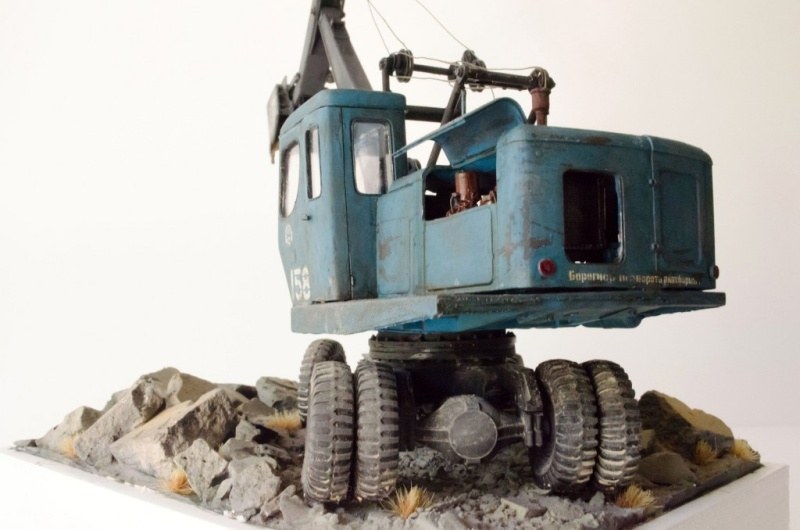 Die eigentliche Lackierung erfolgt anschließend mit Farben von Vallejo in Schwarz (Rahmen und Ausleger) sowie einem Türkisblau (Aufbau, Motorabdeckung, Fahrerhaus). Anschließend wird mit einem Zahnstocher und Wasser die Farbe teils wieder abgelöst, so dass die schwarzbraune Grundfarbe wieder zum Vorschein kommt. Somit entstehen sehr realistische Kratzer und Beschädigungen der Lackschicht. Anschließend wird der Motor, Kühler und der Sitz mit dem Pinsel bemalt, bevor dann die Decals aufgebracht werden. Ein Auftrag Mattlack versiegelt alles und schützt die Farben vor dem nun folgenden Weathering. Der Motorbereich wird anschließend mit diversen Washings und Pigmenten gealtert, ausgelaufenes Öl dargestellt aufgemalt, dann werden die Seile (dem Bausatz beiliegendes Drahtseil) ausgeglüht und an den Seiltrommeln montiert. Anschließend wird die Motorabdeckung aufgesetzt und verklebt, ebenso das Gestänge zur Seilführung. Im Bereich der Bodenplatte des Aufbaus sind bereits erste Pigmente aufgebracht, die auch im Bodenbereich des Fahrerhauses sowie der kleinen seitlichen Plattform an der geöffneten Motorabdeckung erkennbar sind. Weitere Verschmutzung folgt dann später, zusammen mit dem Diorama.