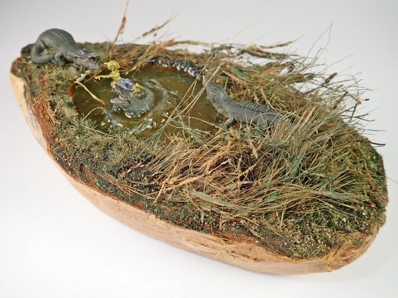 Die Box mit der Bezeichnung Bayou Gators (Alligatorenbucht) von Wyrd Games bzw. Malifaux beinhaltet drei Alligatoren und junge Gremlins. Der eine junge Gremlin spielt gerade ausgelassen auf der Schnauze einer der Panzerechsen. Nicht ganz ungefährlich, denn von einem zweiten Kobold kann man nur mehr den Teil eines Armes im Maul eines Alligators erkennen. Der Rest wurde offensichtlich schon verspeist. Für das kleine Diorama habe ich eine halbe Kokosnuss verwendet. Die Fasern wurden aufgerichtet und bemalt. Künstliches Gras und Streumaterial ergänzten das Ufer. Das Wasser für den Tümpel besteht aus einem handelsüblichen Zweikomponenten-Gießharz.