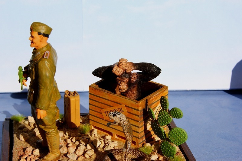Der Zusammenbau des Panzersoldaten und der beiliegenden Kleinteile  war mit einigen kleinen Entgratungs- und Schleifarbeiten verbunden. Mit weiterem Zubehör, Sand und Geröll sowie zwei Schleich-Tieren ist eine kleine Vignette entstanden, die sogleich auch von meiner Frau fotografiert wurde, musste Sie doch ihren WhatsApp-Bekannten mitteilen, womit ich mich in der Freizeit so beschäftige.
