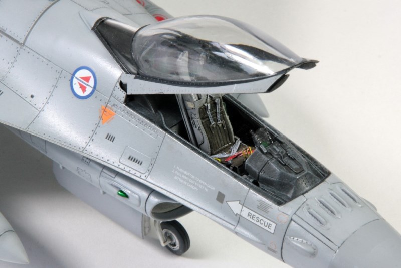 Die Lackierung norwegischer Falcons ist recht einfach – Gunze H308 (Grau FS 36375) über alles, mit Ausnahme des Radoms, das wird mit Gunze H306 lackiert. Damit die Oberfläche nicht zu eintönig wirkt, habe ich die Blechstoßlinien und die Nietenreihen schwarz vorschattiert. Nach der Lackierung mit H308 kam noch eine Mischung aus 60 % Panelliner Black Camouflage und 40 % Grey/Blue Camouflage von AK Interactive zur Anwendung. Dieses Washing auf Emailbasis funktioniert hervorragend und ist ganz einfach zu verarbeiten. Als Ergebnis erhält man schön abgesetzte Panellinien und Nieten.