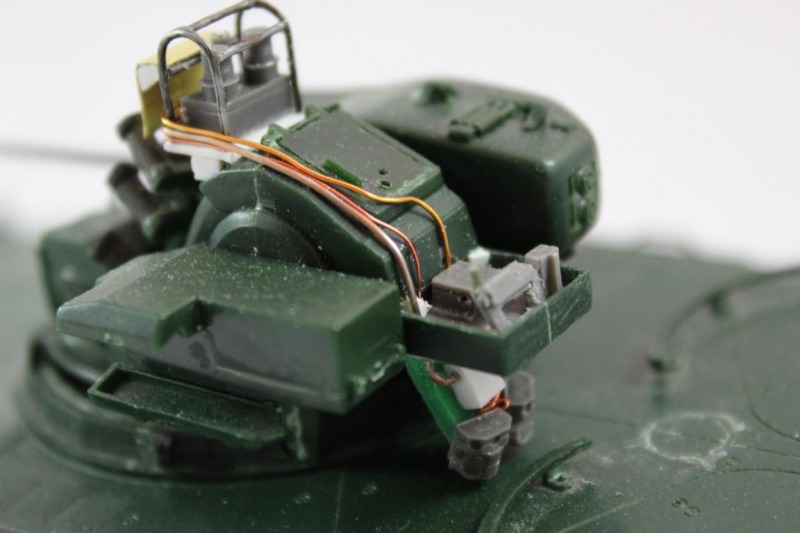 Der Marder A3 ist von Revell. Dieser ist noch aus der Zeit der grünen Spritzlinge. Es gibt von Revell eine Wiederauflage mit der Nummer 03261, welchen ich hier vorstellte. Dort hatte ich ausgiebig über seine „Problemstellen“ hingewiesen. Daher mache ich es hier kurz: ein paar Verschraubungen am Turm, Griffe und Ösen. Die Hupe brauchte ich nicht nachrüsten, denn diesmal ist die vom Stoff verdeckt. Und in die hohlen Winkelspiegel etwas Scheet geklebt. Das Schutzgitter des Wärmebildgerätes (WBG) habe ich herausgeschnitten und ersetzt. Diesmal habe ich auch die Optiken geschlossen dargestellt. Sonst baue ich eher saubere Fahrzeuge. Macht auch Sinn, da ich mich oft an Originalbilder von Rüstungsmessen orientiere.