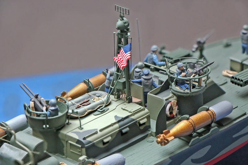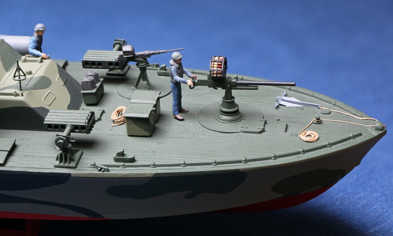 Die 37 mm Automatik-Kanone entstand im Selbstbau aus Polystyrol, Papier und Messingdraht/-röhrchen.  Im Original wurde diese aus der P-39 Aircobra entnommen und später leicht modifiziert als Standard auf den späten Versionen der Elco 80 Boote verwendet. Der Klappanker entstand ebenfalls aus Polystyrol und Papier. Die Raketenwerfer sind dreh- und schwenkbar.