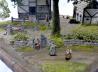 Der Zaun besteht aus Balsaholz, den ich noch mit einer Messingbürste auf alt getrimmt habe. Bemalt und gealtert habe ich den Zaun mit Acrylfarben. Die Mauer besteht aus Gips und wurde von mir selbst hergestellt. Bemalt habe ich die Mauer nur mit Acrylwashes. Das Tor besteht auch aus Balsaholz und wurde von mir nach altbewährter Methode bemalt.