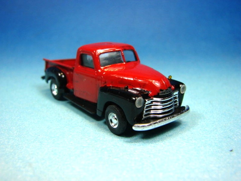 Der 1950 Chevrolet 3100 Pickup stammte von Busch Modellbau Nr. 45013 als Fire Department Truck in Schwarz mit gelber Rundumleuchte. Damit der 1:87 Pickup wie seine Brüder in 1:160 und 1:24 aussieht, wurde das Modell demontiert, die Karosserie in Rot und die Kotflügel in Schwarz lackiert.