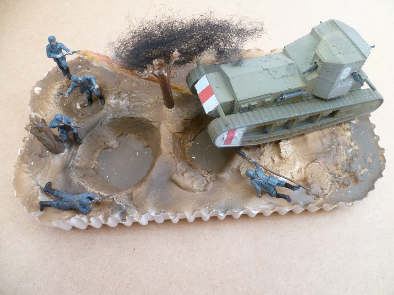 Das Modell stammt von der Firma EMHAR, die mir bis dato völlig unbekannt war. Das Modell ist vergleichsweise einfach aufgebaut, die Detaillierung für meine Ansprüche jedoch ausreichend. Die Passgenauigkeit war gut. Das Diorama zeigt eine Szene aus der Schlacht bei Amiens 1918. Ein Whippet ist dabei, durch die deutschen Linien zu brechen. Zwischen Granattrichtern versucht eine Handvoll deutscher Soldaten, ihn zum stehen zu bringen. Während zwei Mann mit Flammenwerfer und Handgranaten die britische Panzerbesatzung ablenken, kriecht einer ihrer Kameraden aus dem toten Winkel heraus auf den Panzer zu, um das Ungetüm mit einer Sprengladung unter der Kette zu immobilisieren.