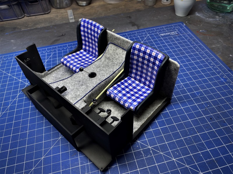 Die Fahrerkabine wurde ebenfalls mit edlen Materialien ausgestattet. Der Dachhimmel ist aus Alcantara, die Sitze haben das richtige Karomuster (ebenfalls gezeichnet und gedruckt) und echtes Leder kam zum Einsatz.