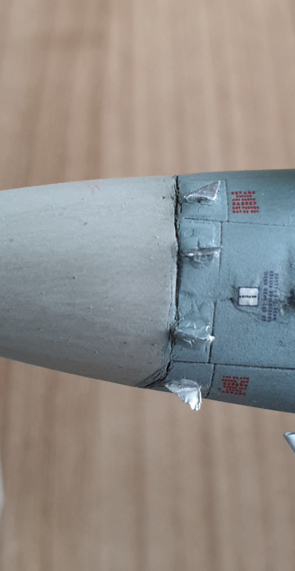 Die Pitot- und Lagesensoren wurden aus Alufolie geschnitten und mit Sekundenkleber angebracht. Ich weiß jetzt nicht, warum Revell diese nicht einfach an den Rumpf mit angießt oder als Anbauteile mitliefert, vor allem, da die Erhöhungen im Rumpf dargestellt sind, aber eben nicht die vier Sensoren.