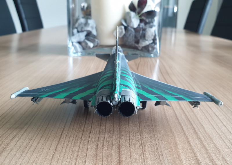 Man könnte natürlich auch noch alle Nietenreihen nachstechen, aber die Arbeit habe ich mir in diesem Maßstab jetzt gespart. Das Bugfahrwerk steht leider schief aber ich wollte es jetzt nicht riskieren es durch zu viel biegen abzubrechen. Mein Typhoon wurde mit vier Meteor, zwei IRIS-T und zwei Zusatztanks bestückt.