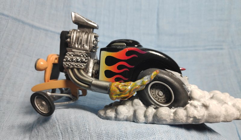 Die Karosserie wurde mit Vallejo schwarz gespritzt und mit zwei Schichten Future überzogen. Danach wurden mit den beigelegten Schablonen die Flammen frei Hand gespritzt und schließlich nochmals mit Future übersprüht. Die Flammen aus den Auspuffrohren sind mit dem Pinsel bemalt. Die Wolken bzw. der Qualm wurde weiß gesprüht und dann mit einigen Washings überzogen.