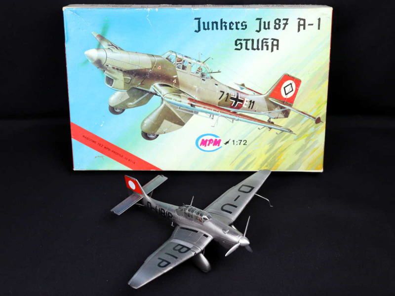 Das Modell entstand aus dem Bausatz von MPM der Junkers Ju 87 A. Der Bausatz ist doch schon sehr betagt und rudimentär. Trotzdem wollte ich ihn bauen. Dem Cockpit habe ich Sitze von Quickboost spendiert. Die Doppelflügel waren massiv mit der Tragfläche verbunden. Hier habe ich eingesägt und den entsprechenden Spalt geschaffen. Die Decals waren aufgrund des Alters nicht mehr zu verwenden, aber ich wollte ja ohnehin keinem Bemalungsvorschlag aus der Box folgen. Die Kennung entstand aus Buchstaben von Fantasy Printshop. Die Bemalung des Seitenleitwerks erfolgte mithilfe von selbst gefertigten Masken und der Airgun. Es gibt einige Fotos der V4, die wohl alle zur gleichen Zeit und im Werk entstanden. Da trägt das Flugzeug keine Bewaffnung im Cockpit und nach meiner Meinung auch keine Sturzflugbremsen. Also habe ich beides weggelassen. Bei den Sturzflugbremsen hätte ich die Teile aus dem Bausatz ohnehin nicht verwendet, die Qualität ist unterirdisch. Die Bemalung erfolgte mit Farben von Vallejo und zur Alterung habe ich Ölfarben verwendet.
