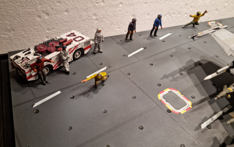 In dem Diorama sind insgesamt sechs Hersteller (Farben ausgenommen) vertreten. Das Deck stammt von Ammo by MIG, die Super Hornet von Meng, die Decals von DXM, das Cockpit und die Abdeckmasken von Eduard, die Figuren von Hasegawa und der Carrier Fire Tractor samt Crew von Verlinden. Die Farben kommen von Hataka, Tamiya, Citadel und Washings und Weathering von MIG, AK, Ammo und Abt.502. Die Acrylglashaube ist eine Maßanfertigung von Sora.