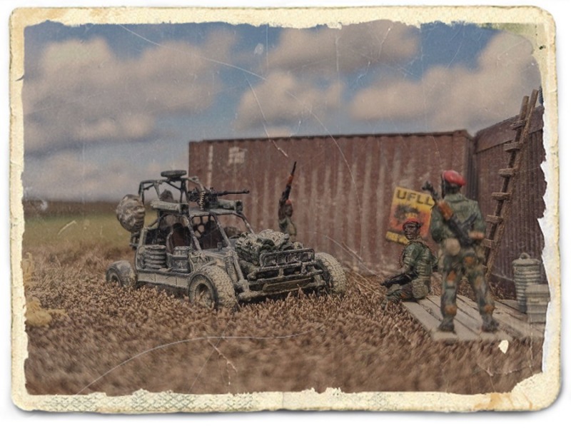 Zum Bau des DioramasInspiriert durch die Videospiele Mercenaries 2 und FarCry 2 entstand die Idee zum Diorama - bei beiden Spielen kommen geländegängige Buggys zum Einsatz. Das Diorama besteht aus einer ca. 25 x 15 cm großen Holzplatte, die ich mit Dekogras (ursprünglich giftgrün) beklebt habe. Die Fahrspuren wurden dabei ausgespart und mit langfasrigem Streugras in Fahrtrichtung beklebt.