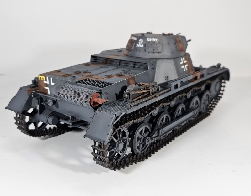 Takom hat dem Panzer I zum ersten Mal 2019 auf den Markt gebracht. Bis 2022 erschienen auf Basis des Grundbausatzes sechs verschiedene Versionen bei Takom und eine von Ammo; mein Modell ist von 2020. Der Bausatz hat trotz seiner Größe eine überschaubare Anzahl an Teilen. An dem Modell können alle Luken offen dargestellt werden, es sind Ätzteile enthalten, die Einzelgliederkette ist voll beweglich. Es liegen Decals für vier Fahrzeuge bei. Es ist keine Inneneinrichtung vorhanden. Die Qualität der Teile und die Passgenauigkeit sind wirklich gut. Der Bau verlief ohne Probleme. Ich wollte das Fahrzeug der 1. Kompanie, Panzerregiment 6, 3. Panzerdivision, das im Juni 1940 in Frankreich im Einsatz war, darstellen. Das Fahrzeug wurde Grau mit den damals üblichen braunen Flecken lackiert. Die Farben stammen von Tamiya. Bei so großen Modellen ist die Farbmodulation wichtig, um das Modell nicht langweilig erscheinen zu lassen. Ich verzichtete auf Verschmutzungen, da das Fahrzeug mal auf ein Diorama soll, das eine Museumshalle zeigt.