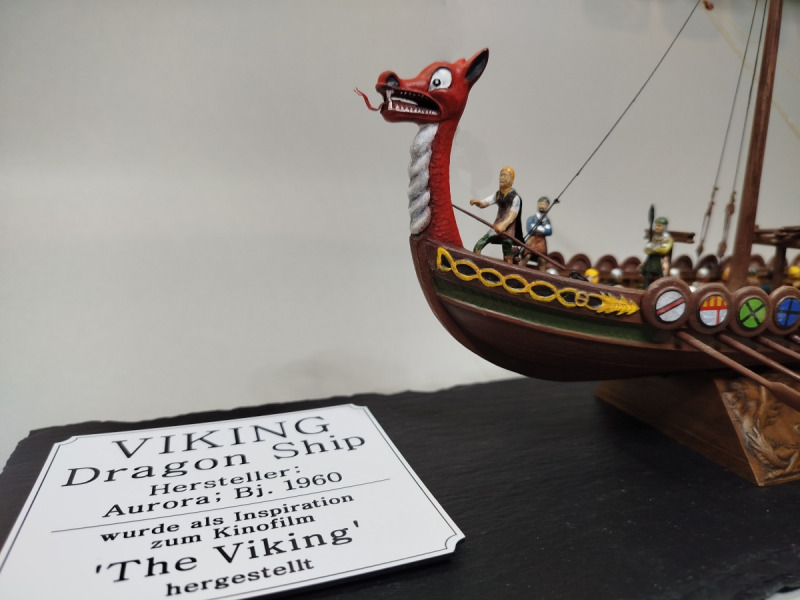 Wenn Aurora das Modell einst als "Viking Dragon Ship" bezeichnet hat, dann soll es ein sogenanntes "Dreki" darstellen, ein Langschiff mit Drachenkopf am Bug. Siehe auch die norwegische Website von Avaldsnes (Link zur übersetzten Seite). Der Drachenkopf sollte Schiff und Mannschaft schützen und Feinde abschrecken.