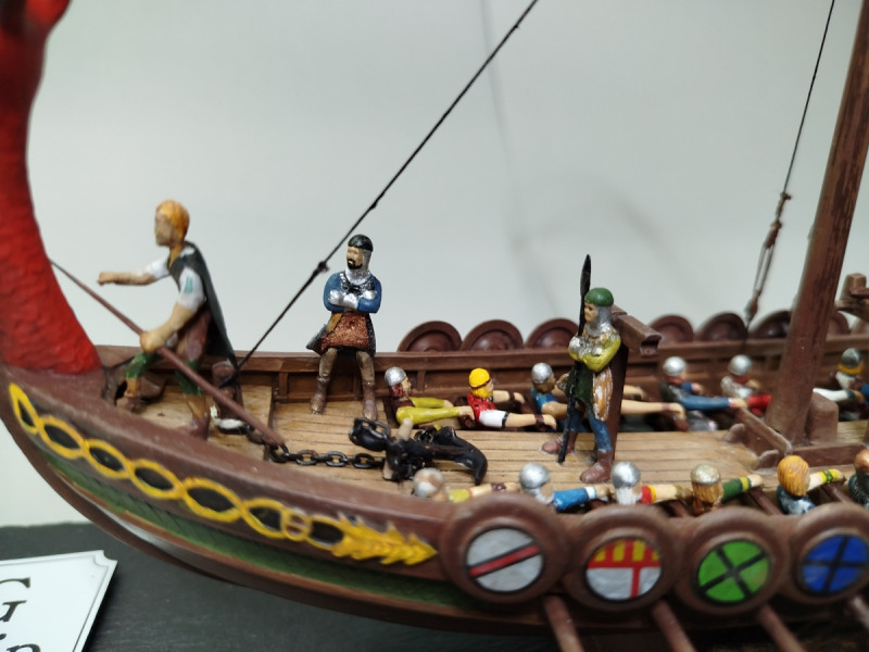 Das Modell ist jedoch Phantasie, und so ist auch die Bemalung ziemlich frei. Auch hier kamen Life-Color Farben zum Einsatz. Das Schild ist von Sagitta-Modellbau, dort ist auch zu lesen, dass das Schiff als Inspiration zum Kinofilm "The Viking" hergestellt wurde.