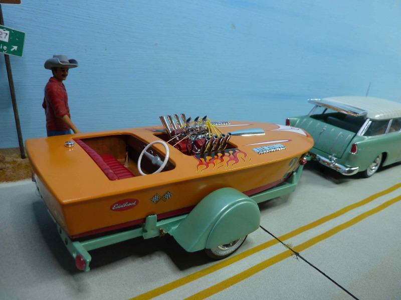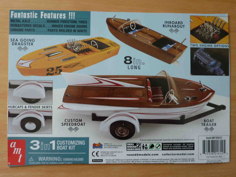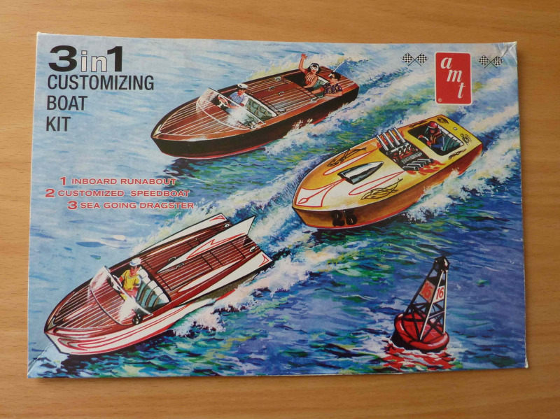 Zunächst fiel mir der AMT-Bausatz des “Customizing Boat Kit“ in die Hände. Eine Wiederauflage von ROUND 2, ein sogenannter 3 in 1 Kit. Es besteht die Möglichkeit, ein Mahagoni-Sportboot, ein Customized Boat mit mittlerer Finne und Heckflossen, oder ein Sea Going Dragster zu bauen. Der Dragster gefiel mir mit dem offenen Motor und der wilden Lackierung am besten. Dragster-Bootsrennen wurden in Südkalifornien auf Flüssen oder Kanälen ausgetragen. Wie bei den Autos wurde über die Viertelmeile gefahren, allerdings mit einem langsamen Start. Maximalgeschwindigkeiten von 95 bis 100 mph waren möglich. "Crackerbox" ist eine der ältesten Inboard-Runabout-Klassen und wird von einem Zweierteam aus Fahrer und Beifahrer, die nebeneinander im Heck des Rumpfes sitzen, gefahren. Es war also Leichtbau angesagt: Also nicht ohne Grund eine „Keksdose“!