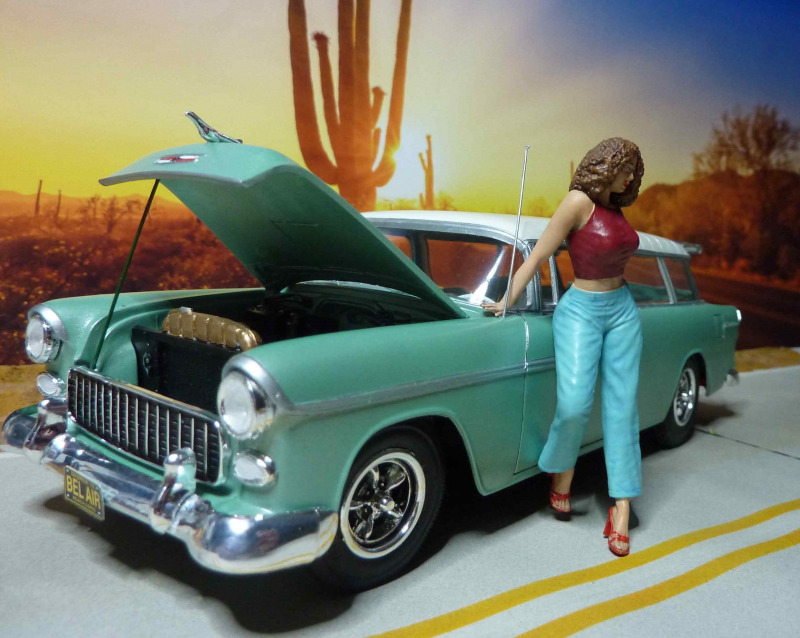 Lange habe ich nach einem geeigneten Zugfahrzeug gesucht. Ein Pick-Up? Ein Van? Dann bin ich in einem bekannten Auktionshaus auf den 1955er Chevy Nomad gestoßen. Leider hatte der Vorbesitzer schon mal alle Teile aus den Tüten entnommen und dann wieder hineingeworfen. Natürlich auch die Glasteile, die dann verkratzt bei mir ankamen. Durch Politur konnte ich noch einiges retten, einen Anpfiff hat der Verkäufer aber dennoch erhalten.