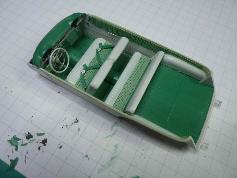 Ich habe ja schon einige Automodelle gebaut, aber der Zusammenbau des Nomads brachte mich fast an meine modellbauerischen Grenzen. Das Glasteil und der obere Teil der Heckklappe ließ sich noch gut zusammenfügen. Anschließend musste die Innenraumwanne den unteren Teil der Klappe aufnehmen; zum Schluss noch den Unterboden einsetzen. War ja klar, dass weder das obere noch das untere Teil der Heckklappe einwandfrei öffnete oder schloss… warum sollte es im Modell anders sein als beim Original. Die Stoßstangenhörner verhindern das vollständige herunterklappen, also musste ich sie leicht versetzen. Ist Euch mal aufgefallen, dass fast alle Autos aus den 50ern bis in die frühen 60er keinen linken Außenspiegel aufweisen? Letztendlich kann ich mich zurücklehnen. Es ist doch noch ein schöner Zug entstanden, der das Lebensgefühl der 50er wiederspiegelt!
