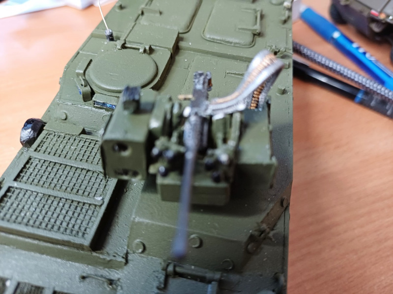 Ebenso wurde mit der Felgenabdeckung verfahren, die Schrauben (Plus Modell) wurden auf die passend zugedrehte Platte geklebt und abgegossen. Der Bug wurde mit Corel Draw konstruiert, auf Etikettenfolie ausgedruckt, somit passte alles ohne Fugen zusammen. Die runden Abdeckungen für die Zusatzpanzerung habe ich mittels Locheisen aus 0,5 mm Plystyrolplatten geschlagen, ebenso die Optik der Sensoren bzw. Kameras, die allerdings vorher mit Flüssigchrom eingestrichen wurden. Dann kam das Hauptproblem: der Waffenstand, bzw die Munitionszuführung. Fast drei Wochen versuchte ich es mit Evergreen Canal und Tamyia-Gurten, bis mir mein Wiener Modellbauhändler, Herr Paul, riet, im Zubehörhandel zu suchen. Und hier wurde ich fündig: bei SuperHobby fand ich die 12,7 mm-Gurte mit den beiderseitigen „feeds“, drei Tage später waren sie aus Warschau da. Mit heißem Wasser wurden sie in Form gebogen, bemalt und eingeklebt, somit war der Pandur EVO fertig.