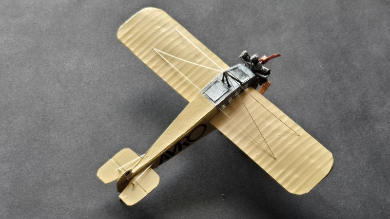 Der Rumpf besteht aus Evergreenprofilen und Laminierfolie, die bereits einmal durch das Laminiergerät gelaufen ist. Dadurch ist sie extrem klar und somit eine gute Basis für die Fenster. Für die Fenster erstellte ich mir aus Tamiya-Tape Abdeckmasken und lackierte die einzelnen vier Seitenteile nach einer Grundierung aus der Sprühdose (links, oben, unten und rechts), bevor alles zusammengesetzt wurde. Die Gitterkonstruktion des Rumpfs wurde, da im Original aus Holz, entsprechend mit Ölfarbe gemasert. Der Sitz stammt aus einem fotogeätzten Teil von Part, die Gurte sind aus Tamiya-Tape. Unterkonstruktion, Instrumente, Steuerknüppel etc. sind aus Evergreenprofilen. Die Skalen der Instrumente habe ich mir nach einer Vorlage aus dem Netz für die Avro Type F selbst als Decal gedruckt. Sie sind aber bei einem Durchmesser von 1,2 mm für jedes Instrument und der Auflösung meines Druckers nur mäßig lesbar. Auch die AVRO-Schriftzüge der Flügel und Seitenteile wurden auf transparenter Decalfolie selbst gedruckt, während die Nummer "2" für das Leitwerk auf weißer Decalfolie gedruckt wurde.